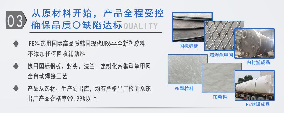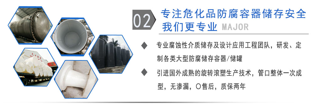 公司有鋼襯塑PE/PO、PE全塑、碳鋼、不銹鋼四大系列100多個品種,專注于常壓儲存容器生產,其產品包括鋼襯塑儲罐、管口一體成型PE儲罐、碳鋼儲罐、不銹鋼儲罐、反應釜、攪拌罐、離子交換柱、鋼襯PE/PO儲罐塑料儲罐、鹽酸儲罐硫酸儲罐等等。更大限度滿足廣大客戶的各種需求,同時可以根據客戶的需要加工定制各種防腐設備。